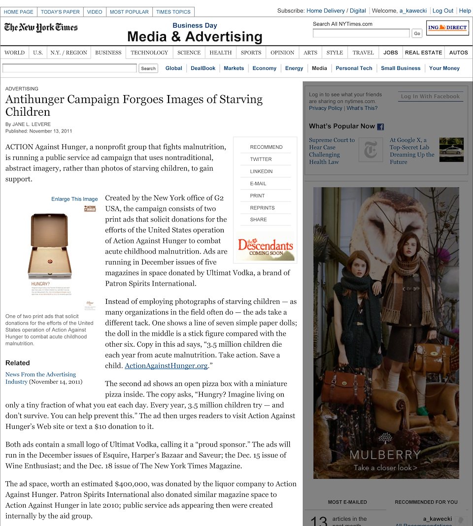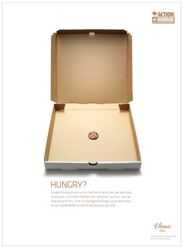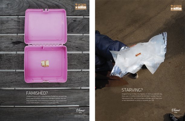 This pro bono work for Action Against Hunger was written up in the NY Times for its unique, attention-grabbing approach. Unrelated: While typing this description, I accidentally typed bro bono, which is a completely new category of advertising, as well as a term I should trademark immediately.