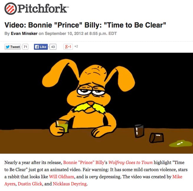 I worked with my old partner and an MTV writer to create the official music video for critically acclaimed indie singer-songwriter Will Oldham (he’s the other bearded guy in the Kanye video Zach Galifianakis stars in). The animation is admittedly pretty low budget, but it’s a great story and super depressing. Pitchfork liked it.