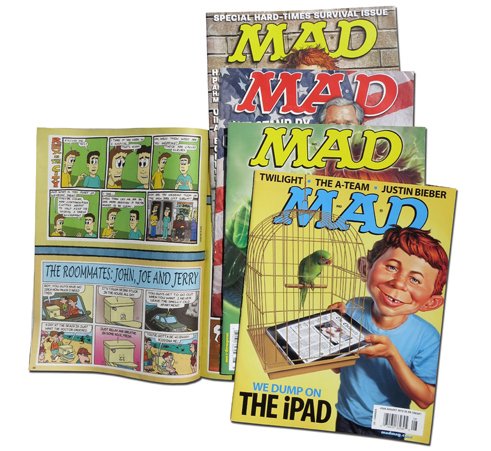 These are a few of the issues my comics have appeared in. Top left is one of mine. I was also honored to have my work included in Totally MAD, a 60th anniversary coffee table book covering the best of the magazine’s storied history.